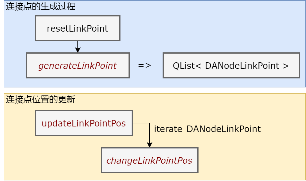 正常连接点信息生成完成就不会发生变化,但如果节点图元缩放时,需要更新连接点的位置信息,需要通过DAAbstractNodeGraphicsItem::updateLinkPointPos函数进行位置信息的更新,此函数会遍历每个连接点,并调用DAAbstractNodeGraphicsItem::changeLinkPointPos函数,对每个连接点进行重新设置